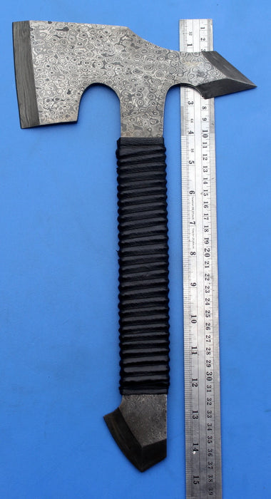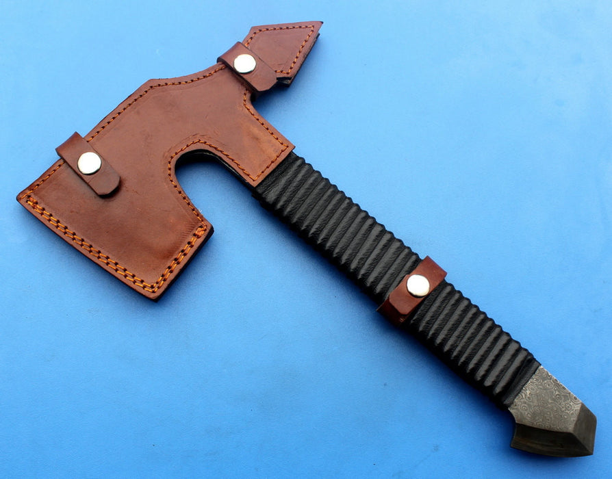HTK - 139 Custom Handmade Damascus Axe / Camping / Hunting / Full Tang / Leather Wrap / Chisel Edge