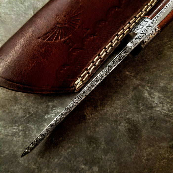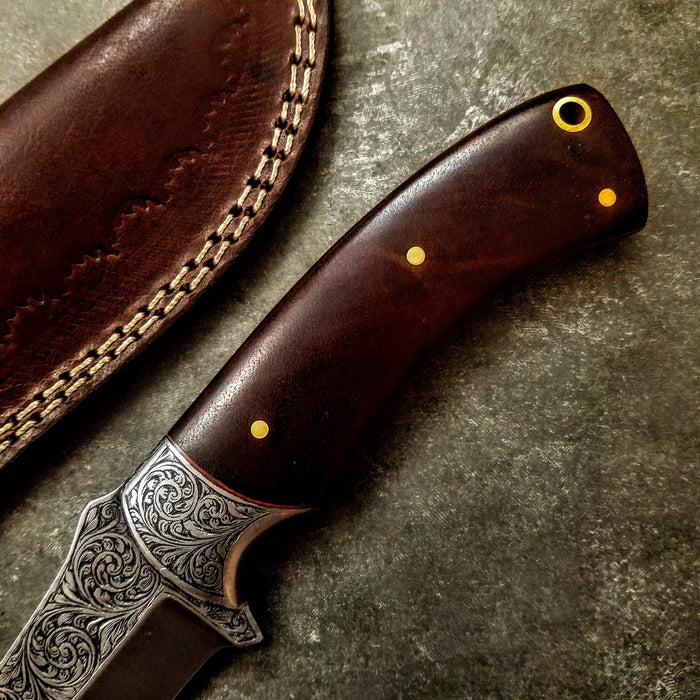 Hometown Knives 440C steel skinner is hand engraved and crafted to appeal all eyes. This fixed blade skinner has over 40 hrs of work into it including forging, filing, fitting, grinding, polishing. The scales are locked in place with the multiple stainless steel pins to the handle, and topped off with a steel bolster. The handle is smooth with no steps and feels natural when held in the hand. The knife is weighted to have a balance point just above the bolster, to better help in long skinner jobs. Impressive workmanship on this knife!