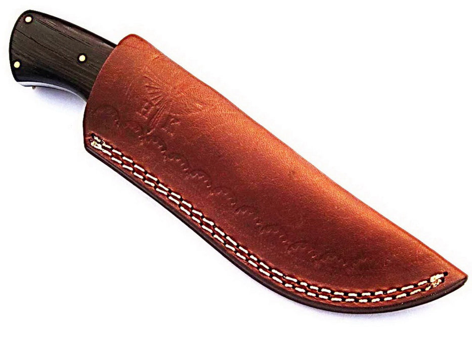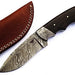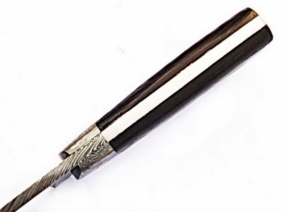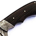 Hometown Knives Damascus skinner / utility knife is hand crafted to be functional and not just for looks. Utility Knife has over 18 hrs of work into it including forging, filing, fitting, grinding, polishing. The dark micarta scales are locked in place with the multiple stainless steel pins and brass pins to the handle, and topped off with a damascus bolster. The handle is smooth with no steps and feels natural when held in the hand. The knife is weighted to have a balance point just above the bolster, to better help in long skinner jobs. Impressive workmanship on this knife!
